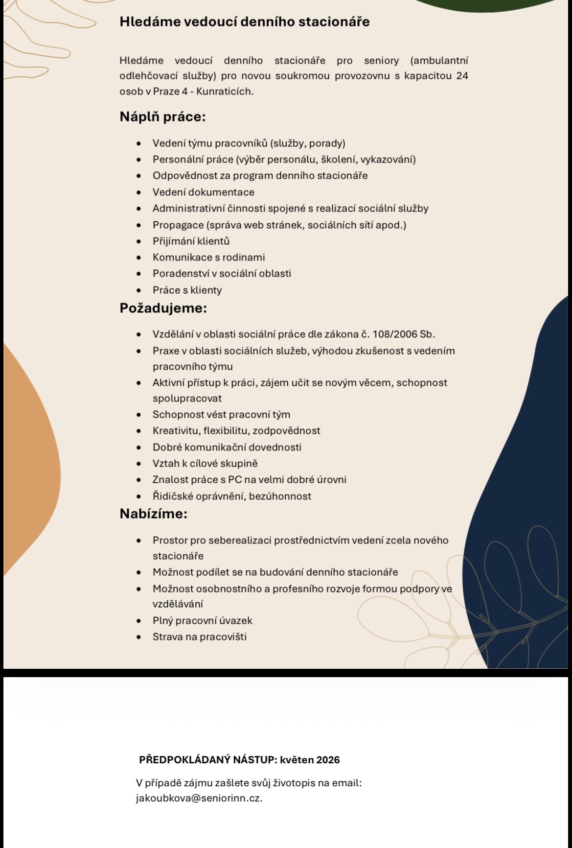 Máte požadované vzdělání, zkušenosti a praxi v oblasti sociálních služeb? Chtěli byste pracovat v super týmu skvělých lidí? Pak jste člověk, kterého hledáme🤩! Ozvěte se!!