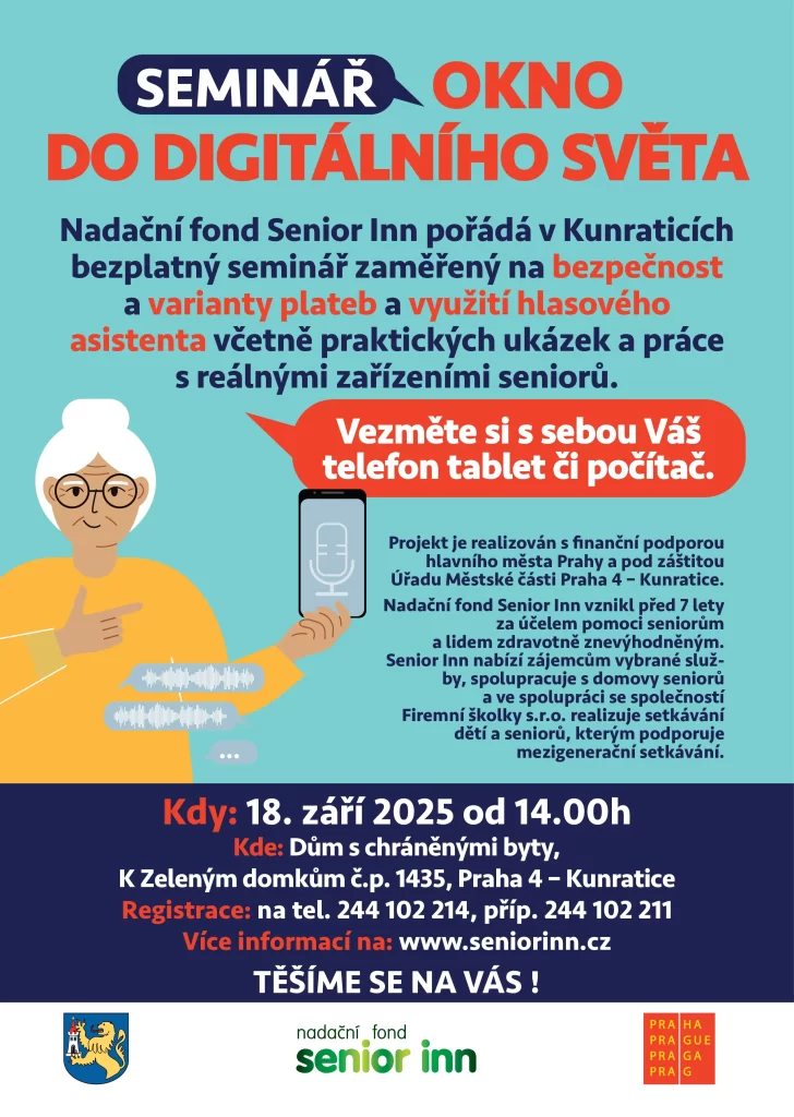 Tentokrát se vydáme do Kunratic. Připravili jsme bezplatný seminář zaměřený na bezpečnost v online prostředí, varianty plateb a používání hlasového asistenta. Nejde jen o teorii – senioři si vše vyzkouší přímo na svých vlastních telefonech, tabletech nebo počítačích.